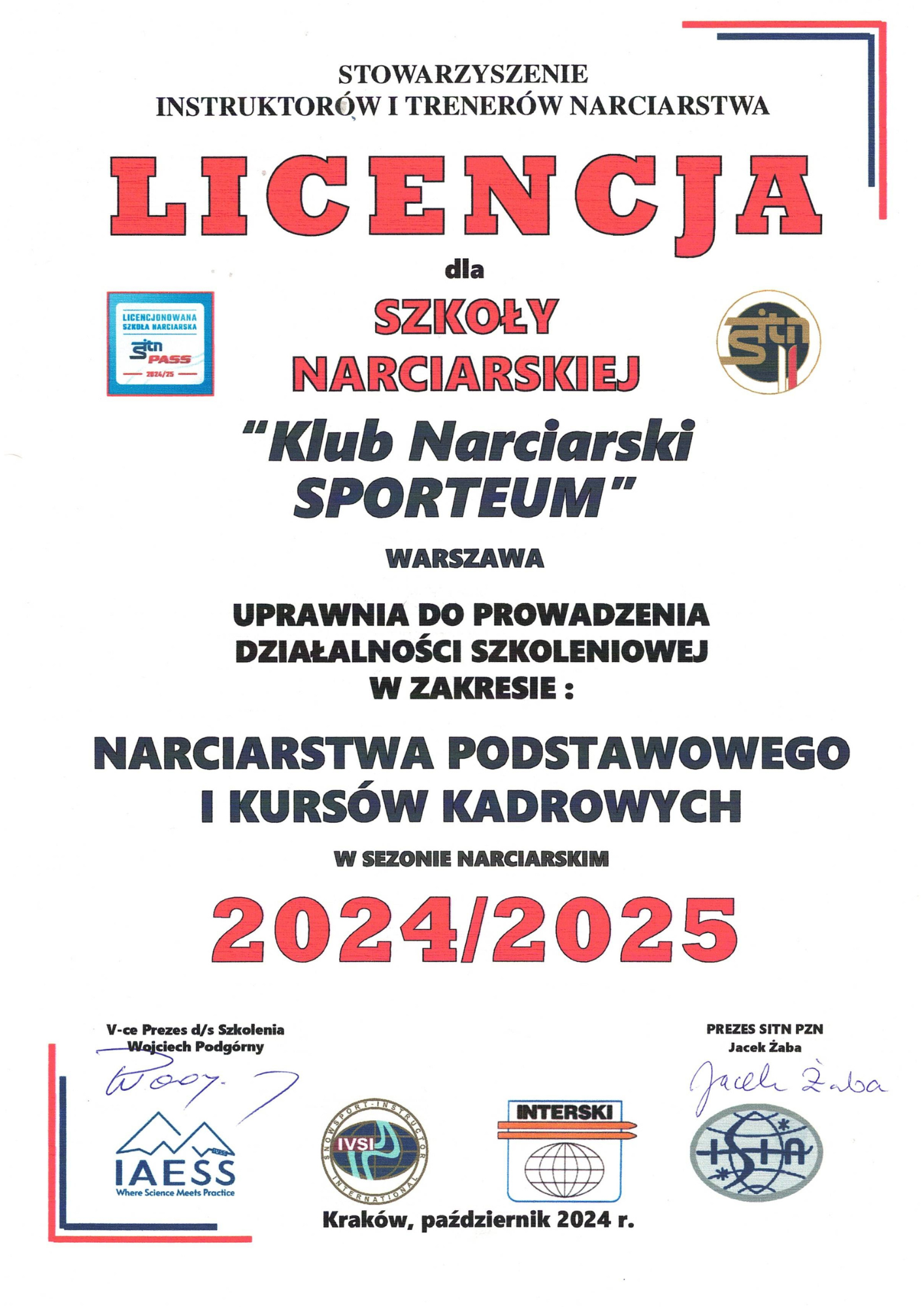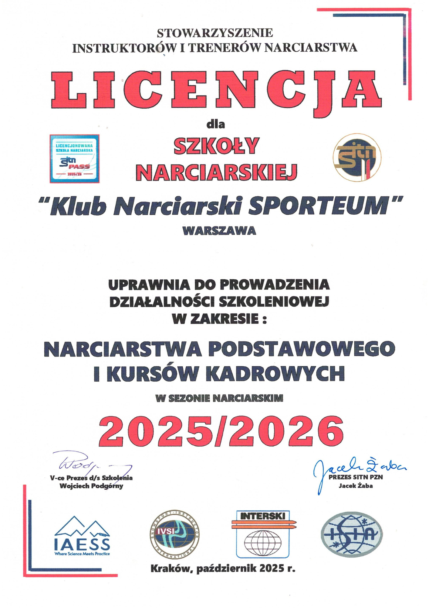 Szkoła narciarska Klubu Sporteum posiada licencję A i D Stowarzyszenia Instruktorów i Trenerów Narciarstwa – Polskiego Związku Narciarskiego.